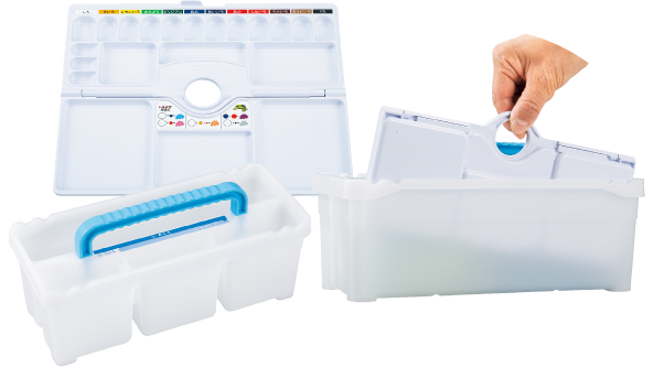 筆(ふで)・絵(え)の具(ぐ)・パレット・筆(ひっ)洗(せん)(バケツ)…何が入っているのかな? 使いやすいくふうがいっぱい!