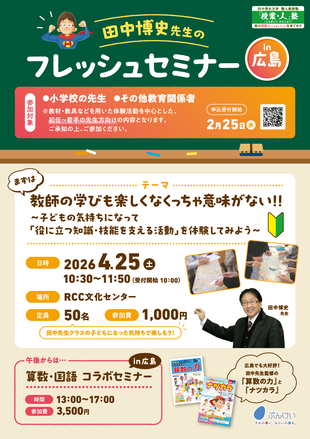 | 概要 | 2026年4月25日(土) 【フレッシュセミナー】 時間:10:30~11:50 定員:50名 料金:1,000円 対象:小学校の先生、その他教育関係者 ※初任~若手の先生方向けの内容となりますので、ご承知の上、ご参加下さい。 【コラボセミナー in 広島】 時間:13:00~17:00 定員:100名 料金:3,500円 対象:小学校の先生、その他教育関係者 |